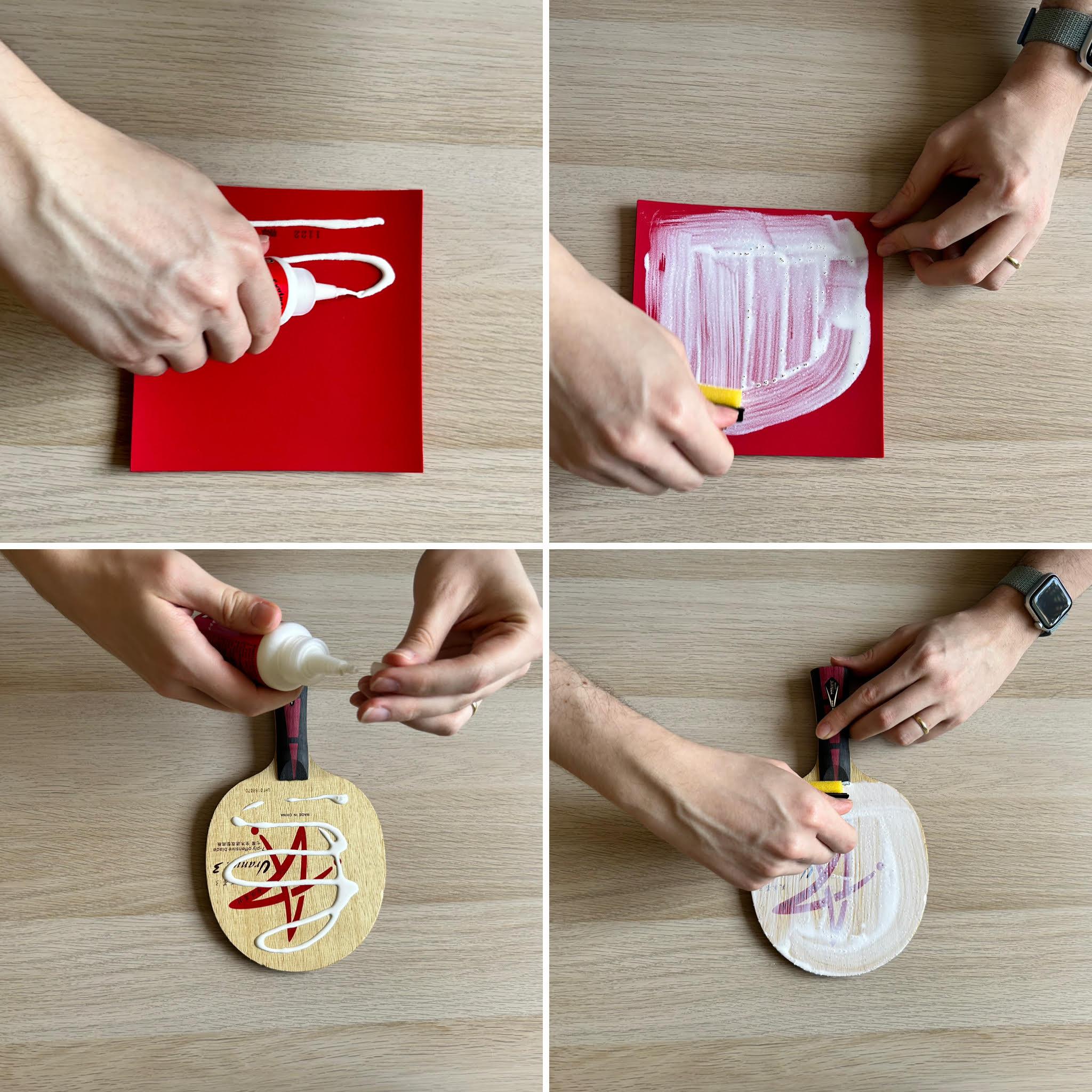 Az első teszteléshez mindenképpen tisztafát szerettem volna igénybe venni, hogy mindenféle plusz gyorsító, harapó hatás nélkül tudjam vizsgálni a játékparamétereket, így a borítást egy Yinhe Uranus U3 ütőfára ragasztottam fel Revolution 3.0 vizes bázísú normál viszkozitású ragasztó használatával. A második teszthez a Xiom Hugo Calderano HAL ütőfámat vetettem be. Annak ellenére, hogy két-két réteget vittem fel az első ragasztás során is az ütőfára, illetve a borításra is, meglepően könnyen, mindenféle ujjbegyes dörzsölgetés nélkül tudtam „újrahasználni” a borítást a második ütőfán, ami nem elengedhetetlen szempont a tesztelni, próbálgatni kedvelő sporttársak esetében.